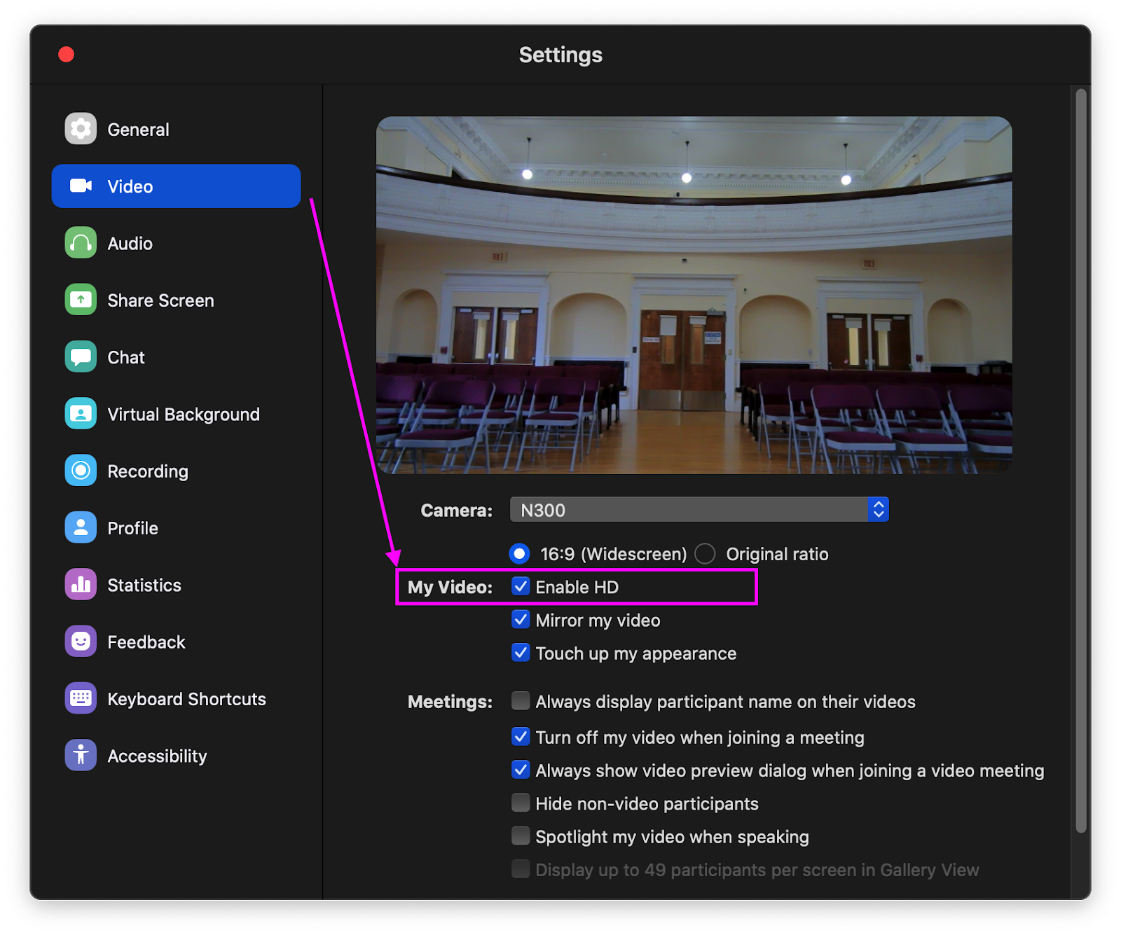 Choose the option that has your model of Webcam. You should see the option “N300” if you recently had yours delivered. Make sure there is a check mark next to that option if that is what you plan to Zoom with.